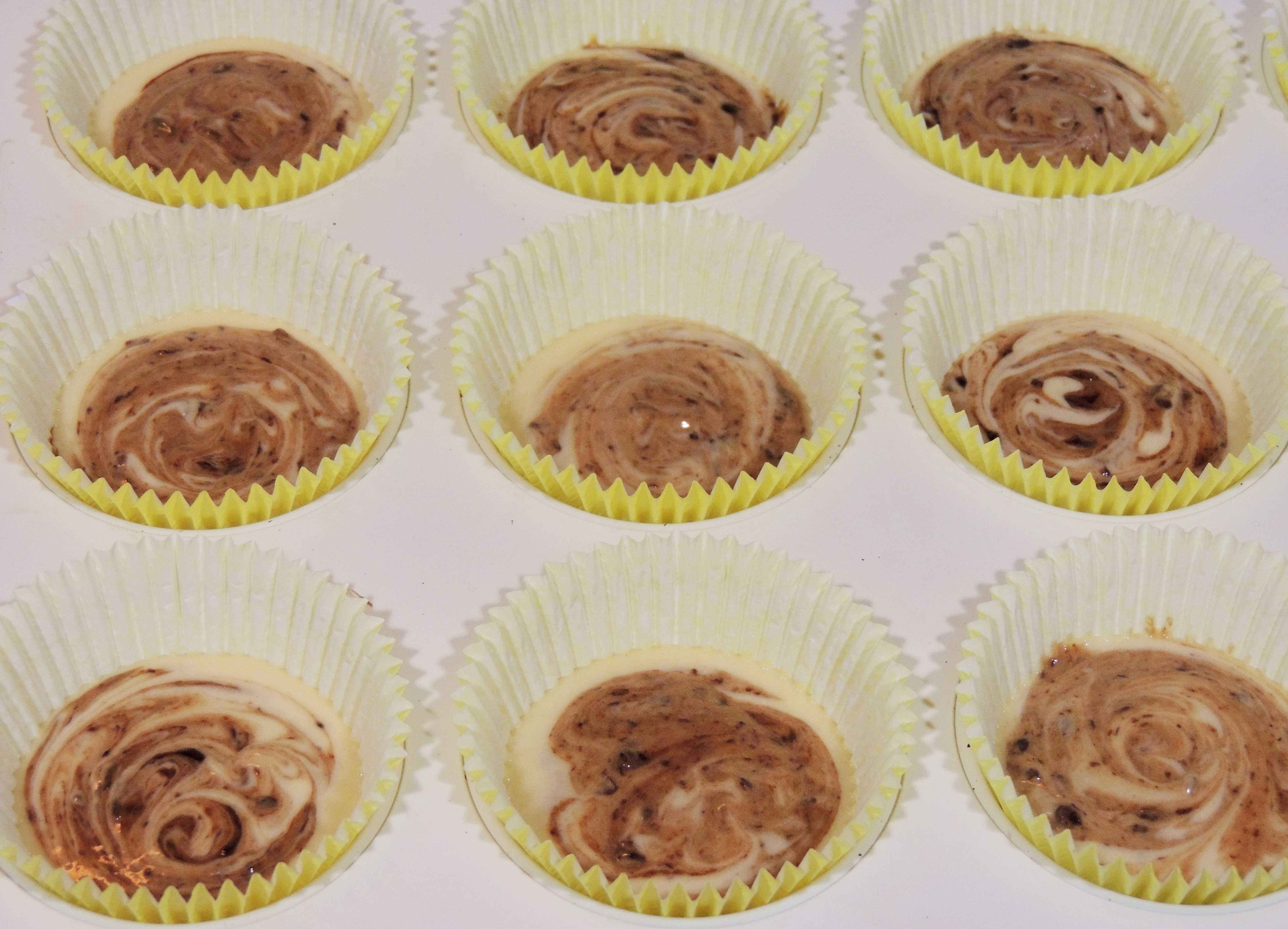 Encha as forminhas até 2/3 da altura, coloque 1/2 cc de geleia em cada uma e misture levemente com um palito para obter um efeito marmorizado.