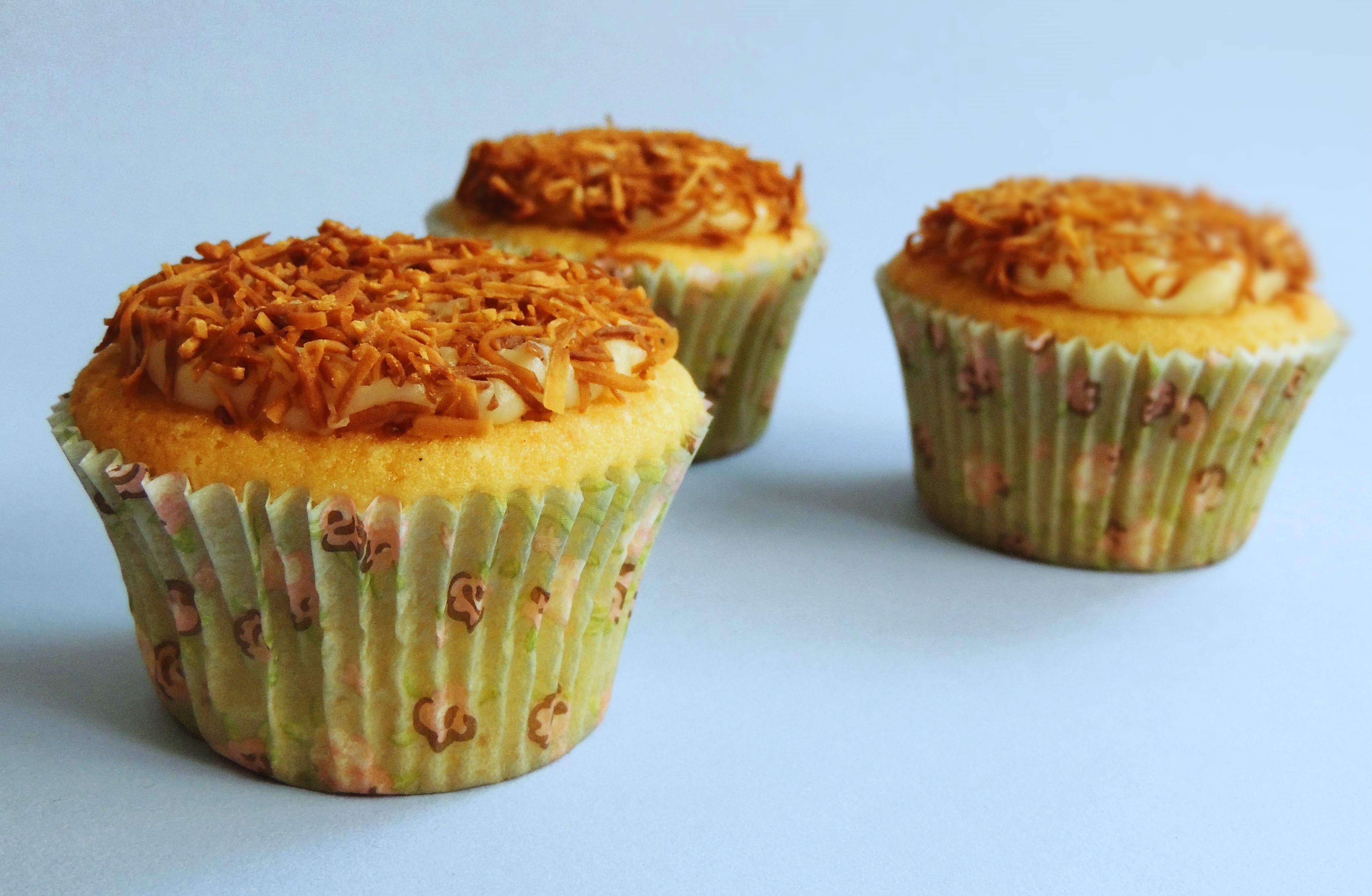Uma vez frio, faça um buraco no centro de cada cupcake, recheie e cubra com o brigadeiro, usando uma espátula pequena. Decore com flocos de coco queimado.